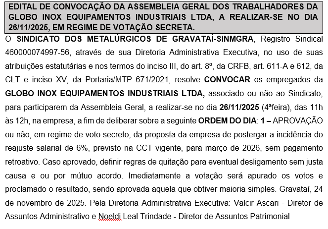 EDITAL DE ASSEMBLEIA – GLOBO INOX