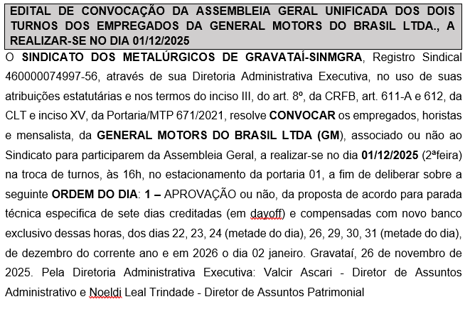 Editais, General Motors ASSEMBLEIA GERAL – GENERAL MOTORS DO BRASIL 26 de novembro de 2025 Postado por Sinmgra Jurídico 26 nov
