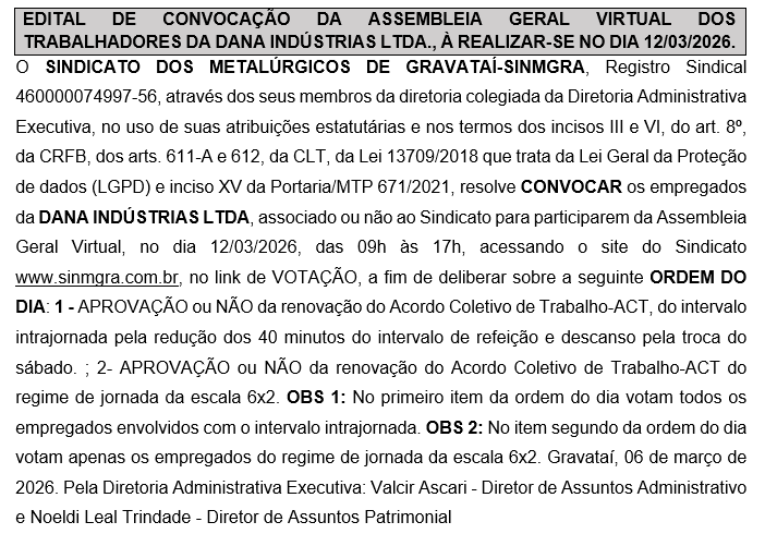 DANA, Editais, Metalurgia ASSEMBLEIA GERAL – DANA INDÚSTRIAS 6 de março de 2026 Postado por Sinmgra Jurídico 06 mar